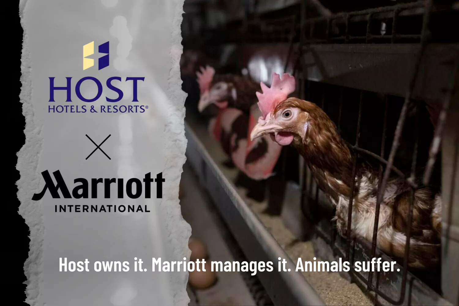 Host Hotels & Resorts is one of the largest owners of Marriott-branded hotel properties. While Marriott International manages the brand, Host Hotels benefits from Marriott’s success as Marriott fails to fulfill its cage-free egg promise, prolonging animal cruelty in its egg supply chain.