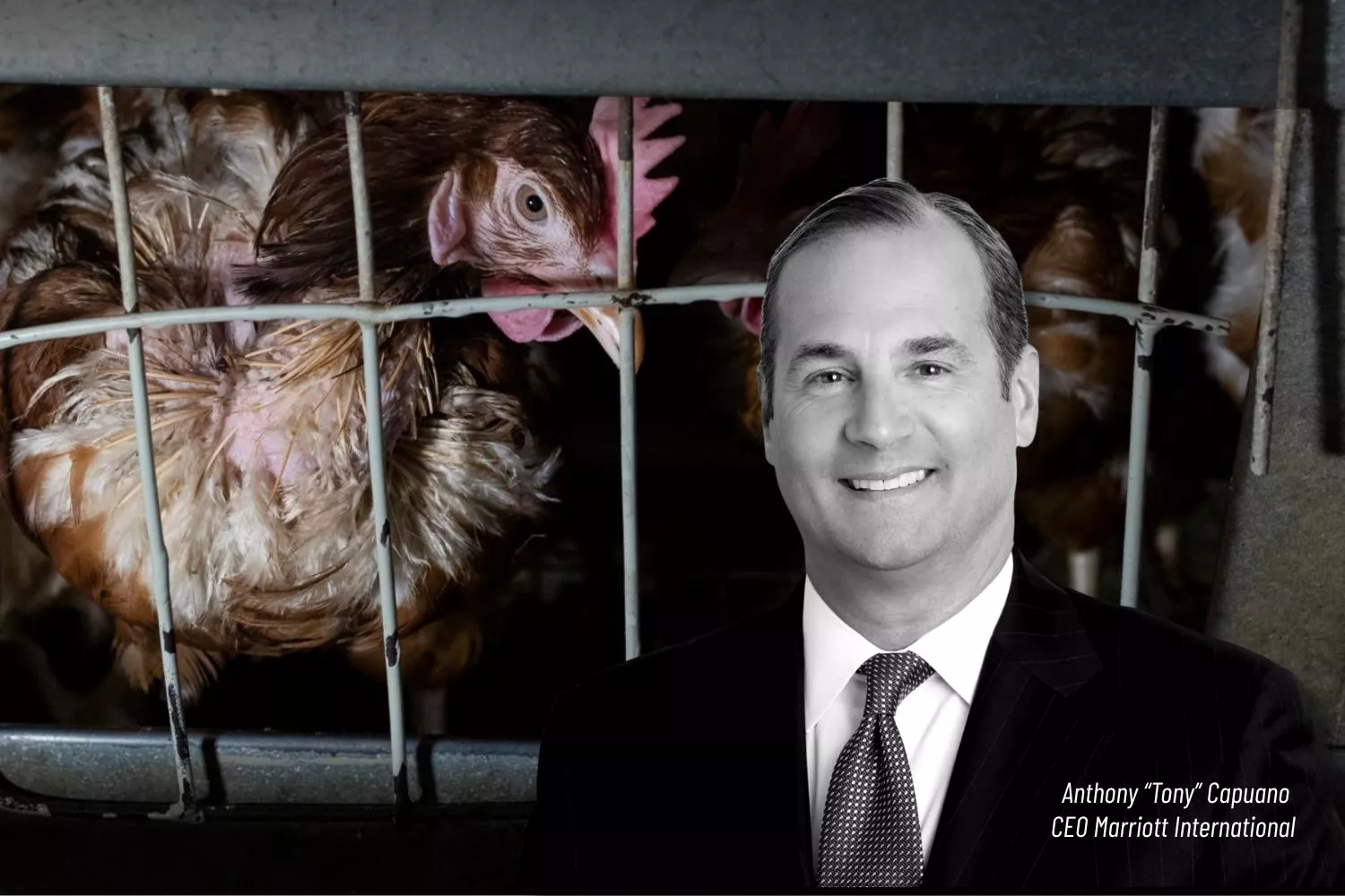 Five years ago, Tony Capuano became CEO of Marriott International. Since then, hens in Marriott’s global egg supply chain remain trapped in cages — despite the company’s public promise to go cage-free by 2025.