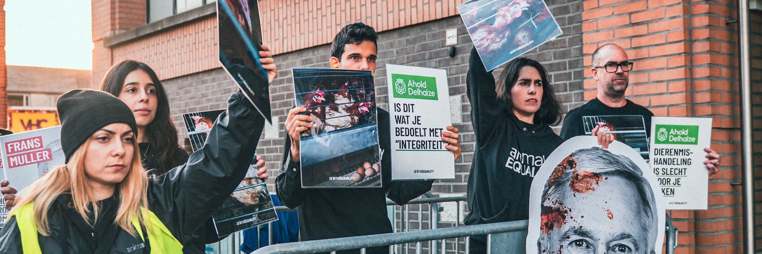 Update December 2024 – Animal Equality began protesting companies that share board members with Ahold Delhaize–including Pandora Jewelry, Symrise, Bunzl, and Customs Support Group. These secondary campaigns increase pressure on Ahold Delhaize’s Supervisory Board, the group responsible for its animal welfare policies.