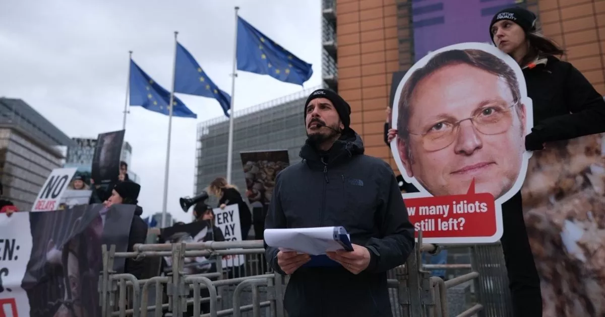 Protesters displayed banners naming the EU’s Commissioner for Health and Animal Welfare, who is overseeing reforms expected in 2026.